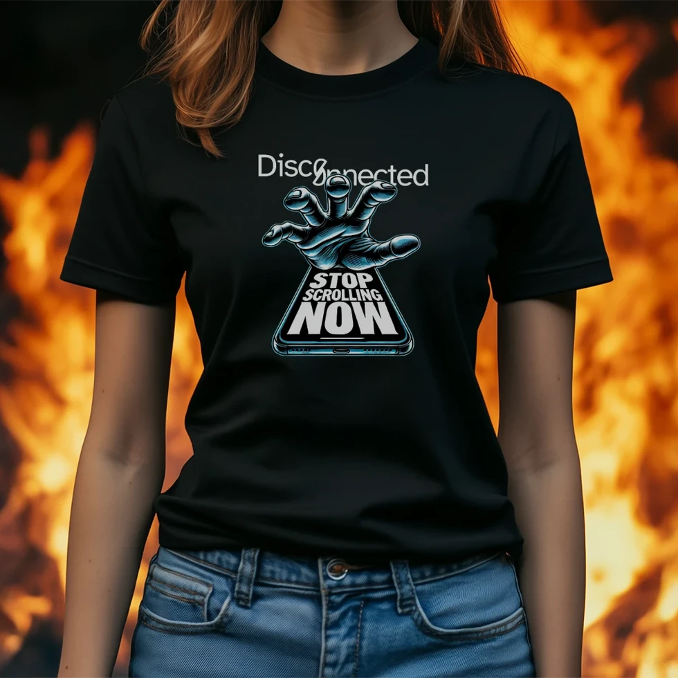End the madness. The Stop Scrolling Now t-shirt comes with a reminder: the average user scrolls the length of the Eiffel Tower daily. Enough is enough—put the phone down.