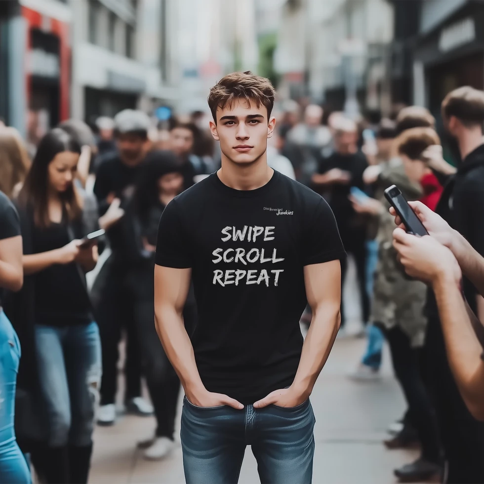 Sound familiar? This t-shirt nails the loop you live in—but with style. A modern uniform for those caught in the feed but self-aware enough to laugh at it. Soft cotton, crisp design—wear it while trying to escape the cycle (or giving up entirely).
