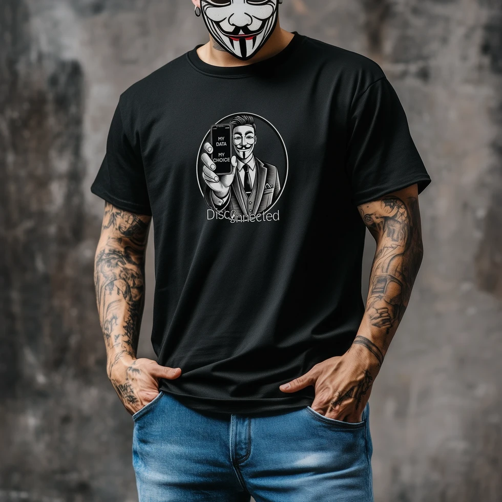 That’s why we created Disc0nnected Anonymous. This collection is about making a stand before it’s too late. Every t-shirt features a character holding out a phone, with the words “My DATA, MY CHOICE” lit up on the screen. The message is clear: the fight for data privacy affects everyone, everywhere.