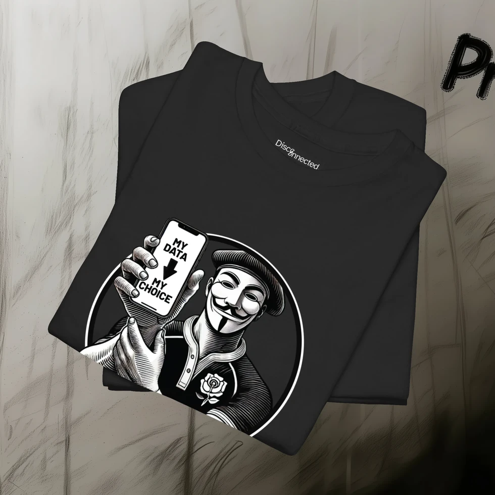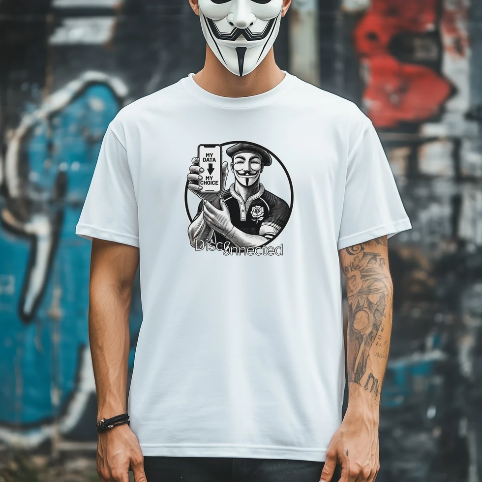 That’s why we created Disc0nnected Anonymous. This collection is about making a stand before it’s too late. Every t-shirt features a character holding out a phone, with the words “My DATA, MY CHOICE” lit up on the screen. The message is clear: the fight for data privacy affects everyone, everywhere.