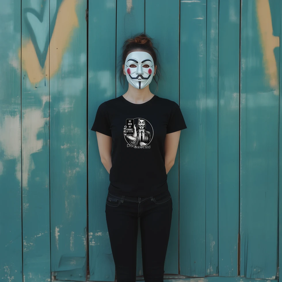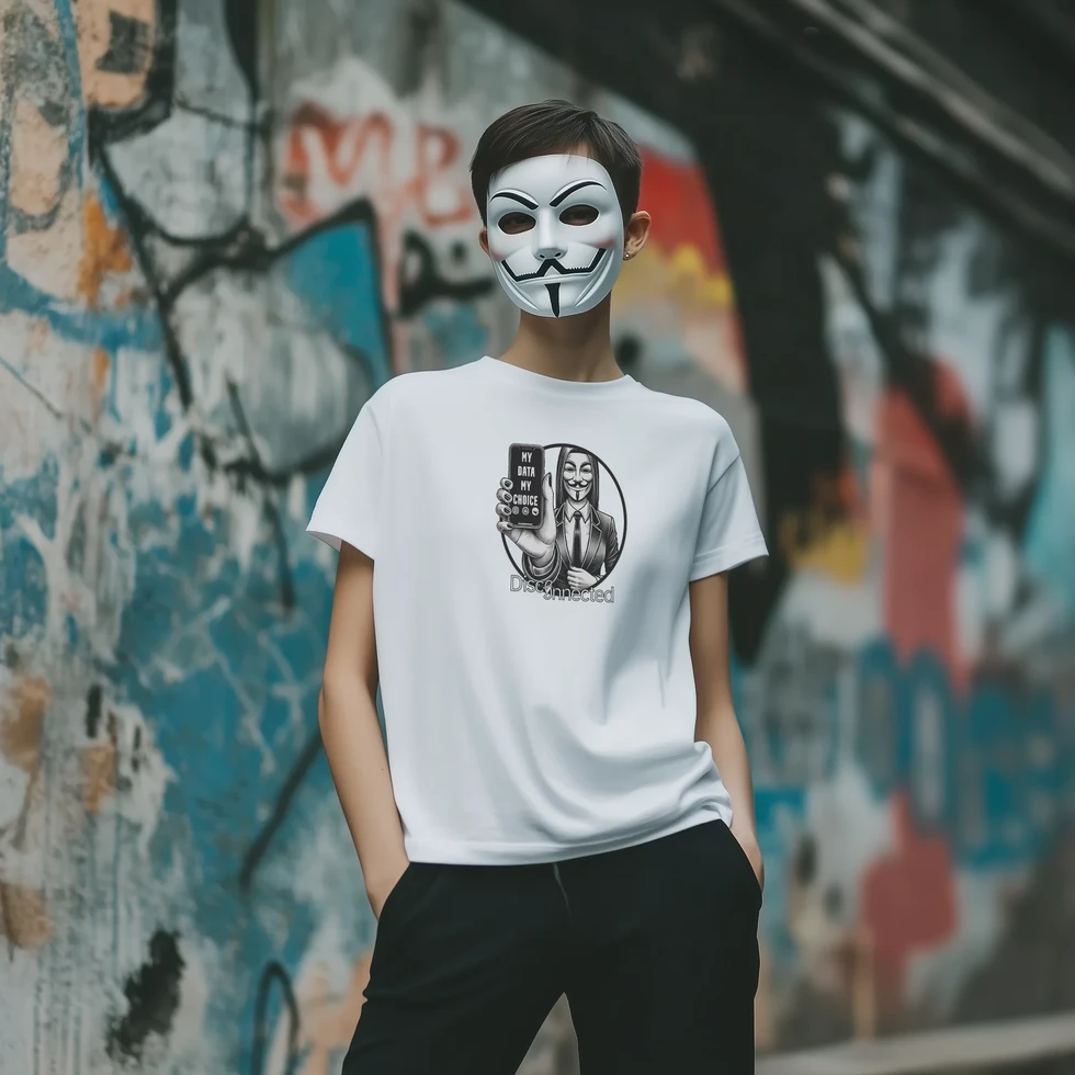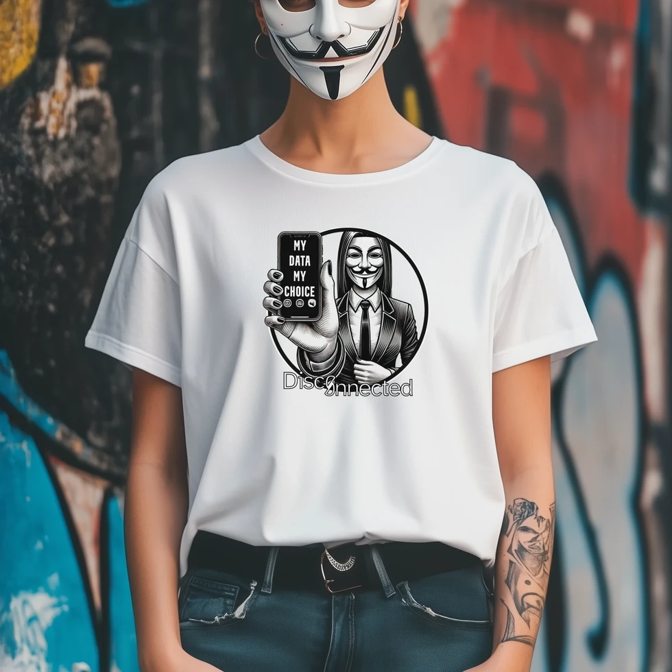 That’s why we created Disc0nnected Anonymous. This collection is about making a stand before it’s too late. Every t-shirt features a character holding out a phone, with the words “My DATA, MY CHOICE” lit up on the screen. The message is clear: the fight for data privacy affects everyone, everywhere.