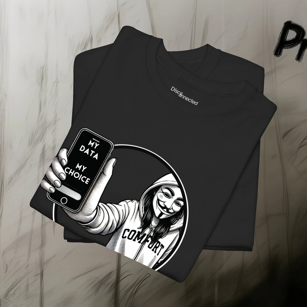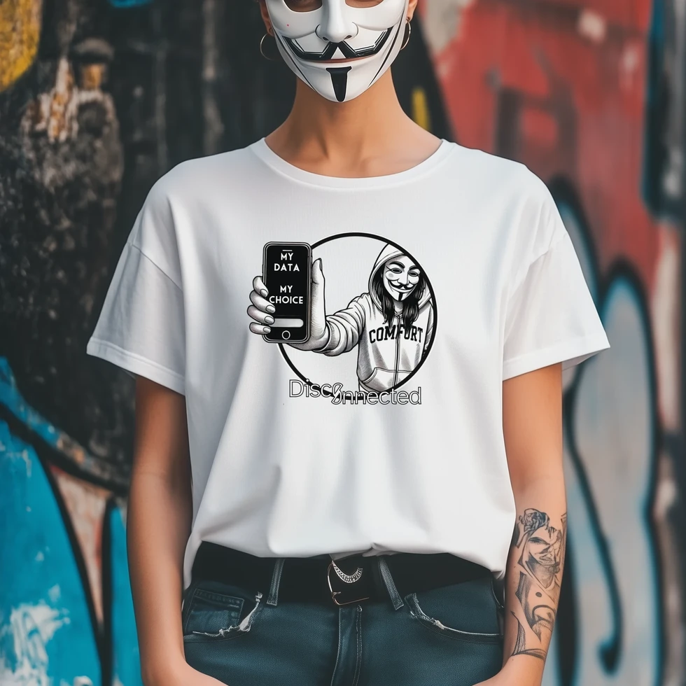 That’s why we created Disc0nnected Anonymous. This collection is about making a stand before it’s too late. Every t-shirt features a character holding out a phone, with the words “My DATA, MY CHOICE” lit up on the screen. The message is clear: the fight for data privacy affects everyone, everywhere.