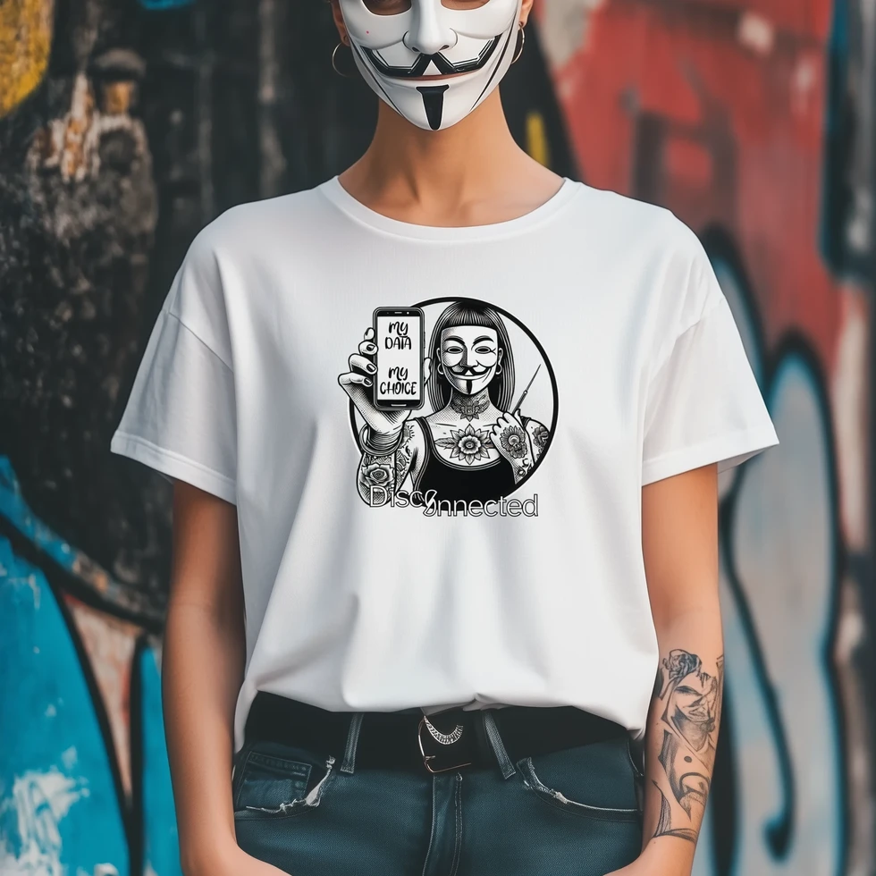 That’s why we created Disc0nnected Anonymous. This collection is about making a stand before it’s too late. Every t-shirt features a character holding out a phone, with the words “My DATA, MY CHOICE” lit up on the screen. The message is clear: the fight for data privacy affects everyone, everywhere.